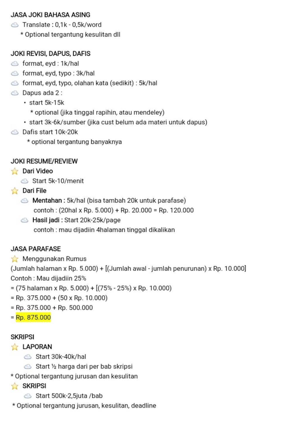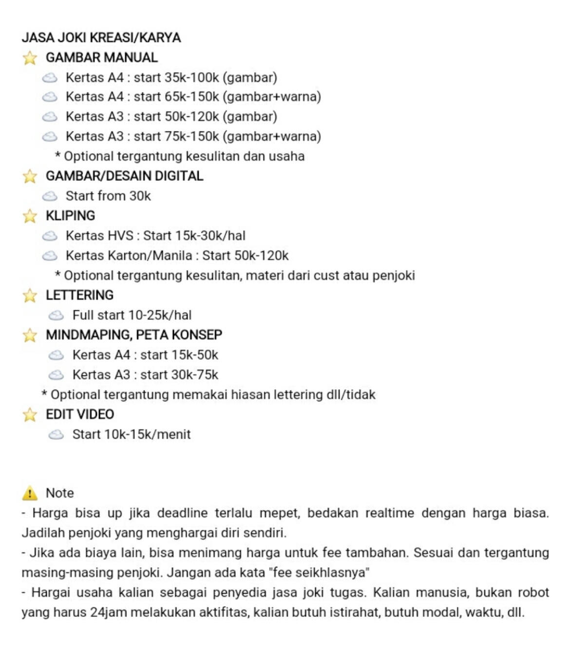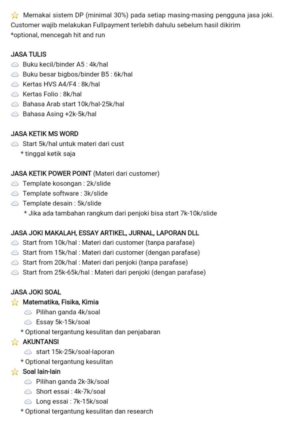 SIAPKAN BUDGET sesuai dengan ketentuan harga pasar joki dan buat kesepakatan DI AWAL.Jika ingin penjoki drop harga, maka tolong berikan DETAIL JELAS DAN LENGKAP tentang tugasnya sampai dengan deadline waktunya juga. Jika ingin penjoki drop harga namun kamu tidak memberikan detail tugasnya, maka penjoki dapat mereply dengan HARGA START nya. (Harga start merupakan harga pasaran. Harga start yang di bawah harga pasaran akan kena block kategori pertama).